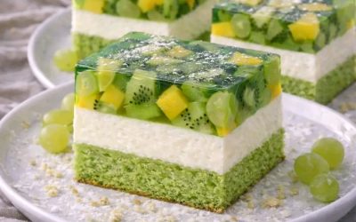 Zielone ciasto z kremem i owocami w galaretce