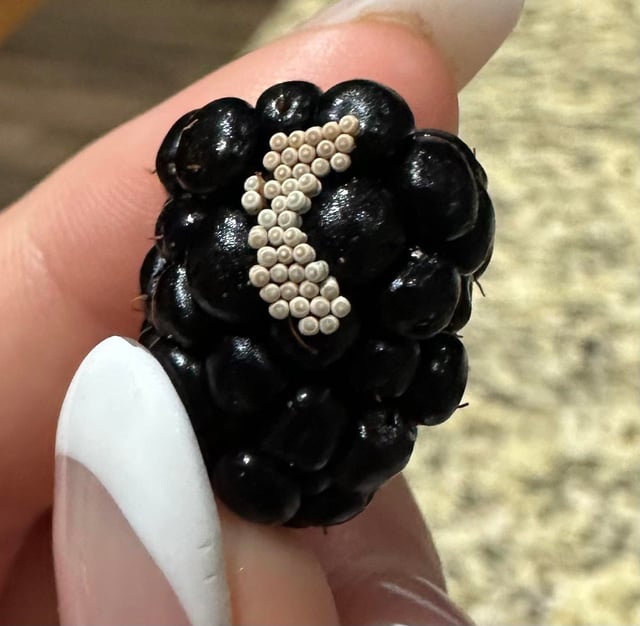 * **Kontekst:** Pluskwy często składają jaja na owocach lub spodniej stronie liści. Znalezienie ich na jeżynie (którą znalazłeś w sałatce) jest powszechne w świeżych produktach, które nie były intensywnie traktowane pestycydami.