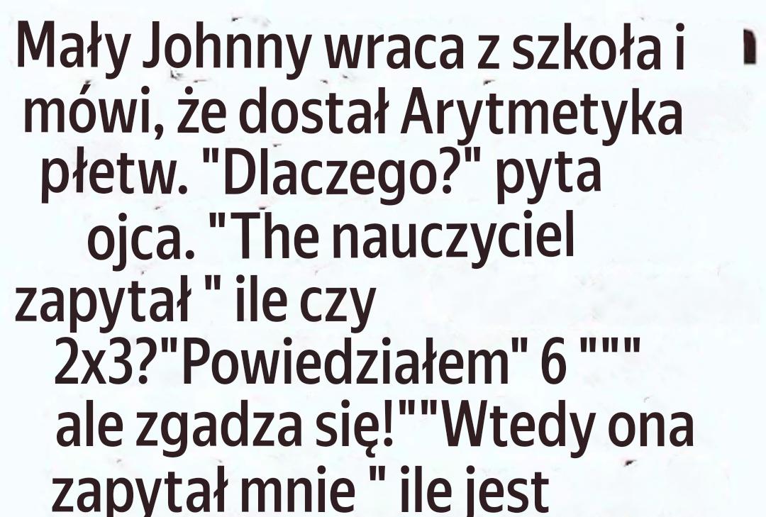 Żart chłopca na lekcji matematyki nie był brakiem szacunku, lecz precyzyjnym wyczuciem czasu. Kiedy nauczyciel zapytał: „Jeśli masz pięć jabłek i zabierzesz dwa, co ci zostanie?”, spokojnie odpowiedział: „Problem z kradzieżą i trzech świadków”. Klasa wybuchła śmiechem. Nauczyciel z kamienną twarzą przeszedł dalej, ale jego tata później powtórzył tę historię przy stole, śmiejąc się tak głośno, że musiał ocierać oczy, po cichu zachwycony, że jego syn potrafi przekuć logikę w śmiech.